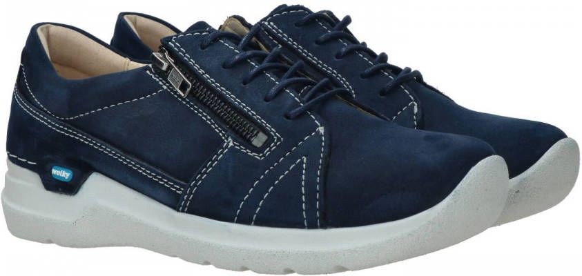 Wolky Feltwell comfort veterschoen in het donkerblauw van Wolky. Deze comfortabele damesschoen is uitgevoerd in donkerblauw leer met witte stiksels. De binnenvoering is ook gemaakt van leer en de schoen heeft een kunststof loopzool. De sneaker is voorzien van zowel een veter- als ritssluiting en een uitneembaar voetbed.